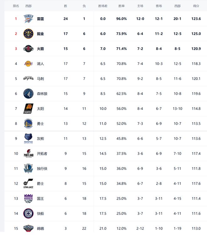 今日比賽后湖人、掘金、火箭排名互換,其他西部球隊(duì)排名不變。