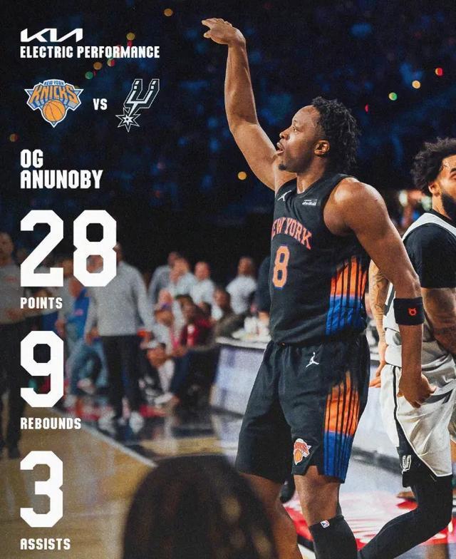 拿到杯賽MVP的布倫森,今天25分8助攻,27中11的效率算得上糟糕了,但在關(guān)鍵時刻,他就是能投中一些穩(wěn)定的中距離。包括今天拿到最高分28分的OG-阿奴諾比,你看不到他太多的持球強攻,分數(shù)都來自于弱側(cè)空位三分以及轉(zhuǎn)換進攻,樸實無華但足夠致命。